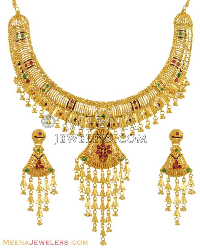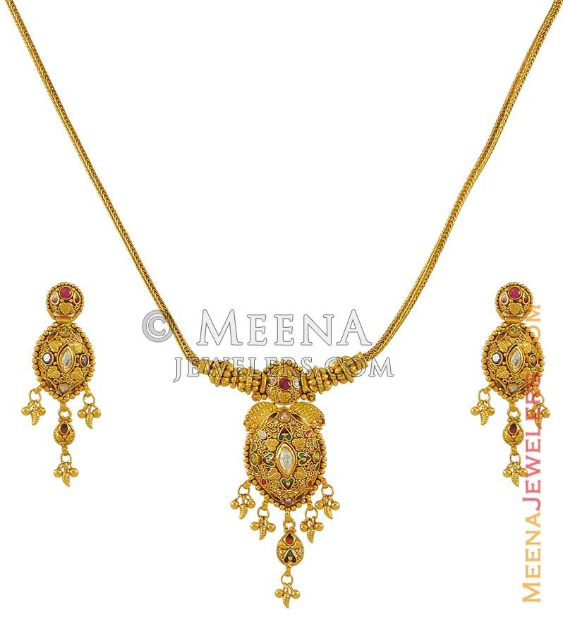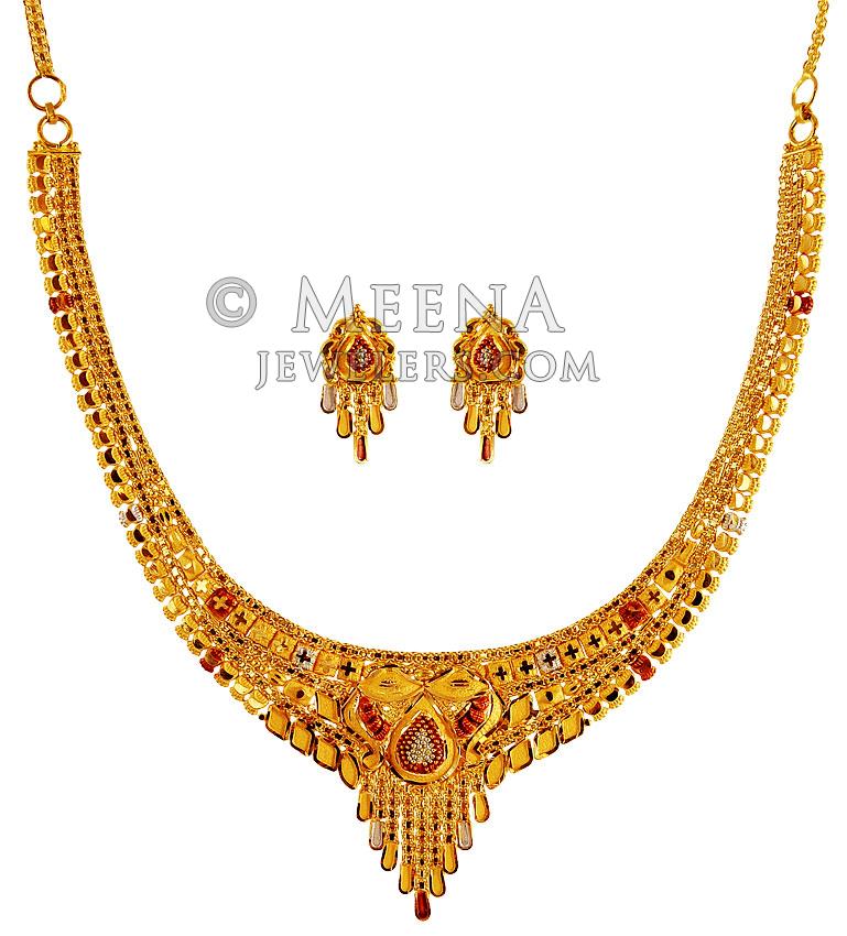 Three Tone 22K Gold Necklace Set - stls19038 - Sets (Necklace) > 22 Kt Gold Sets from ww2.meenajewelers.com Our latest collection of 22k gold modern and contemporary necklace sets. 1 set is ready to ship. This beautiful solid gold necklace is handmade and makes a great investment. The earrings are not complimenting the necklace. Unique vintage coral necklace set 22k gold and single cut diamond rare find. 22k gold plated crystal cz necklace pendant stud earrings wedding jewelry set. The necklace is painted with tradional red and green meena. Gehna presents a stunning necklace and stud set with navaratna gemstones in 22k gold, set in floral patterns with twin leaflets along a perfectly coordinated in leaf pattern chain.